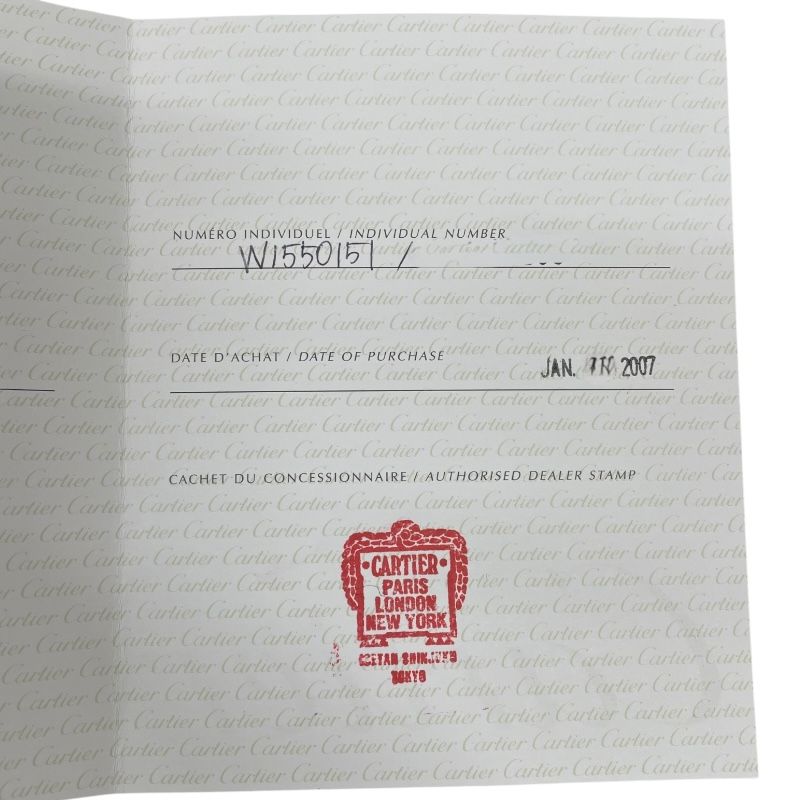 Accompanied by its original box and warranty certificate from January 2007, this timepiece is not just a watch; it is a statement of luxury and a testament to Cartier's rich heritage in watchmaking. The watch is fitted with a custom strap, ensuring a comfortable fit for wrist sizes up to 18cm.