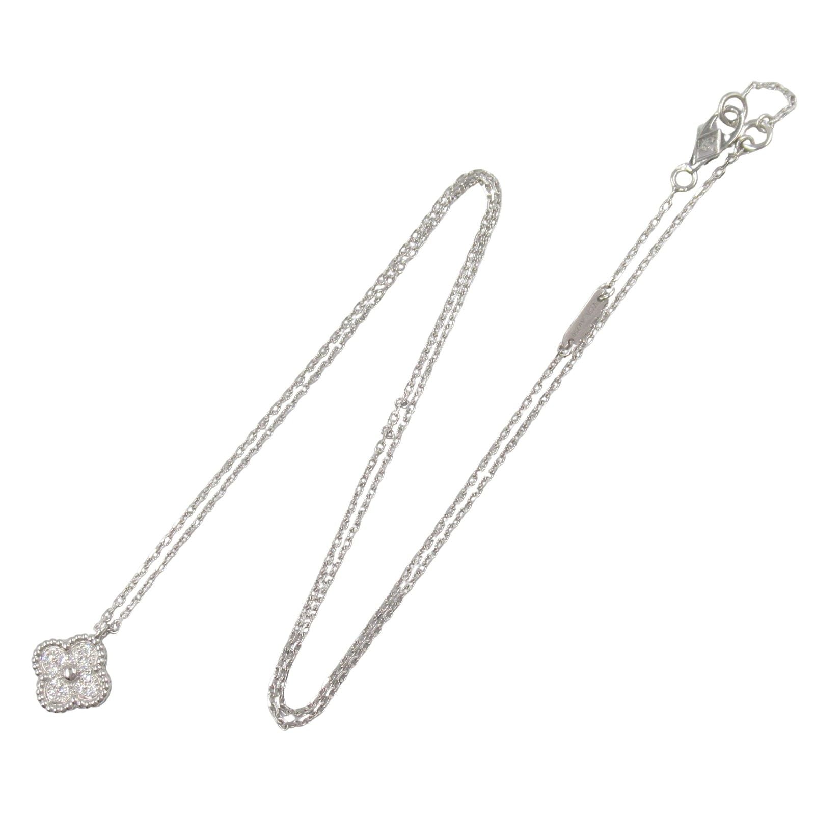 Indulge in the exquisite elegance of the Van Cleef & Arpels Sweet Alhambra Diamond Necklace, a stunning piece that embodies the brand's rich heritage of luxury and craftsmanship. Crafted from 18K white gold, this necklace features a delicate motif adorned with sparkling diamonds, radiating sophistication and charm.