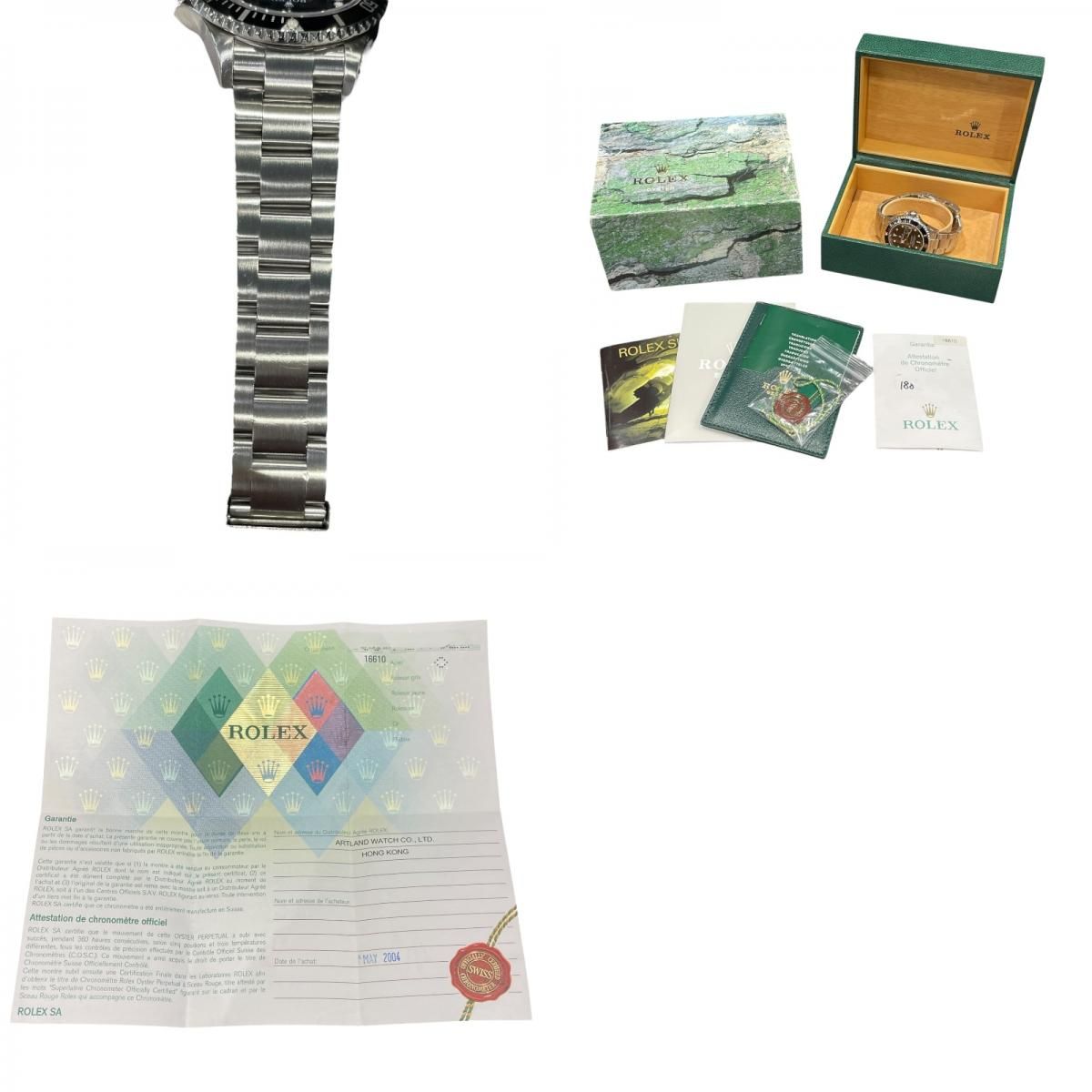 Accompanied by its original box, warranty certificate from May 2004, and internal guarantee from our store, this Rolex Submariner is a rare find for collectors and connoisseurs. Please note that while the watch exhibits some signs of wear, including minor scratches on the bracelet and bezel, these do not detract from its overall allure and investment potential.