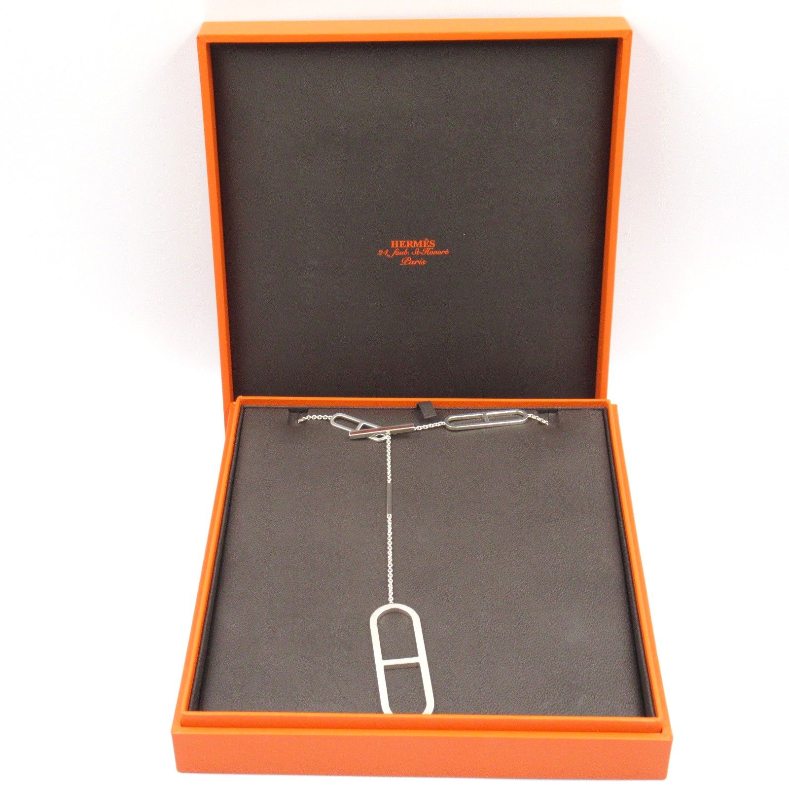 Each link of the chain is meticulously crafted, showcasing HERMES' commitment to quality and artistry. The necklace weighs approximately 34.8g, providing a substantial yet comfortable wear. Although it exhibits slight signs of previous enjoyment, including minor surface imperfections, it has been polished to maintain its radiant shine. This piece is accompanied by its original storage box, ensuring it remains a cherished addition to your jewelry collection.