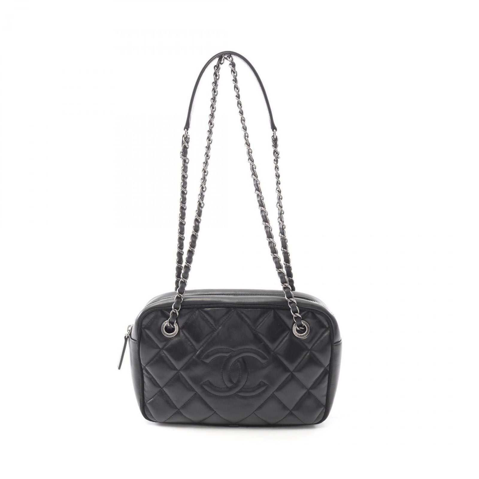 Indulge in the timeless elegance of the CHANEL Matelassé Shoulder Bag, a quintessential piece that embodies the brand's rich heritage and unparalleled craftsmanship. This exquisite handbag, crafted from luxurious black lambskin, features the iconic interlocking CC logo and a sophisticated chain shoulder strap, making it a versatile accessory for any occasion.